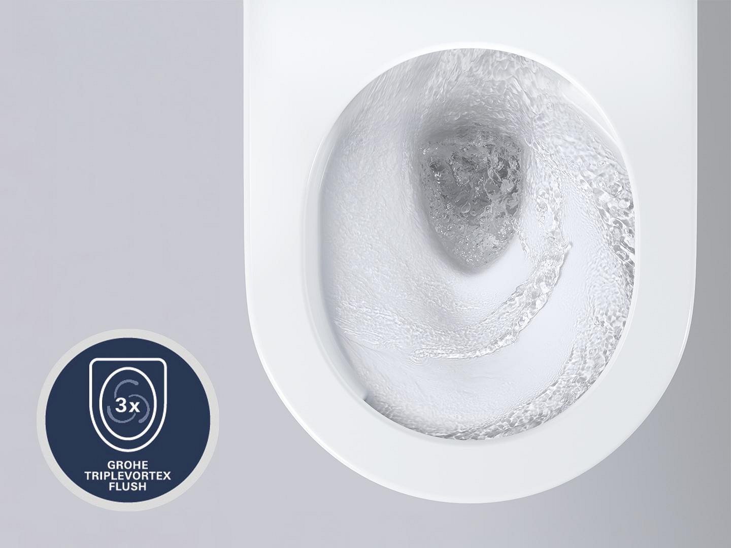 Der Waschtisch und das Wand-WC der Euro Keramik Linie von GROHE bringen runde und eckige Formen in Einklang – so lassen sich die Produkte in viele Badstile integrieren. Die antibakterielle Oberfläche und die neue leistungsstarke Triple Vortex Spülung der Toilette sorgen für noch bessere Hygiene. Die maximale Spülmenge von 4,5 Litern spart Wasser und Geld. Das randlose Design und der abnehmbare Sitz vereinfachen zudem die Reinigung, die Absenkautomatik lässt den Deckel nahezu geräuschlos schließen.