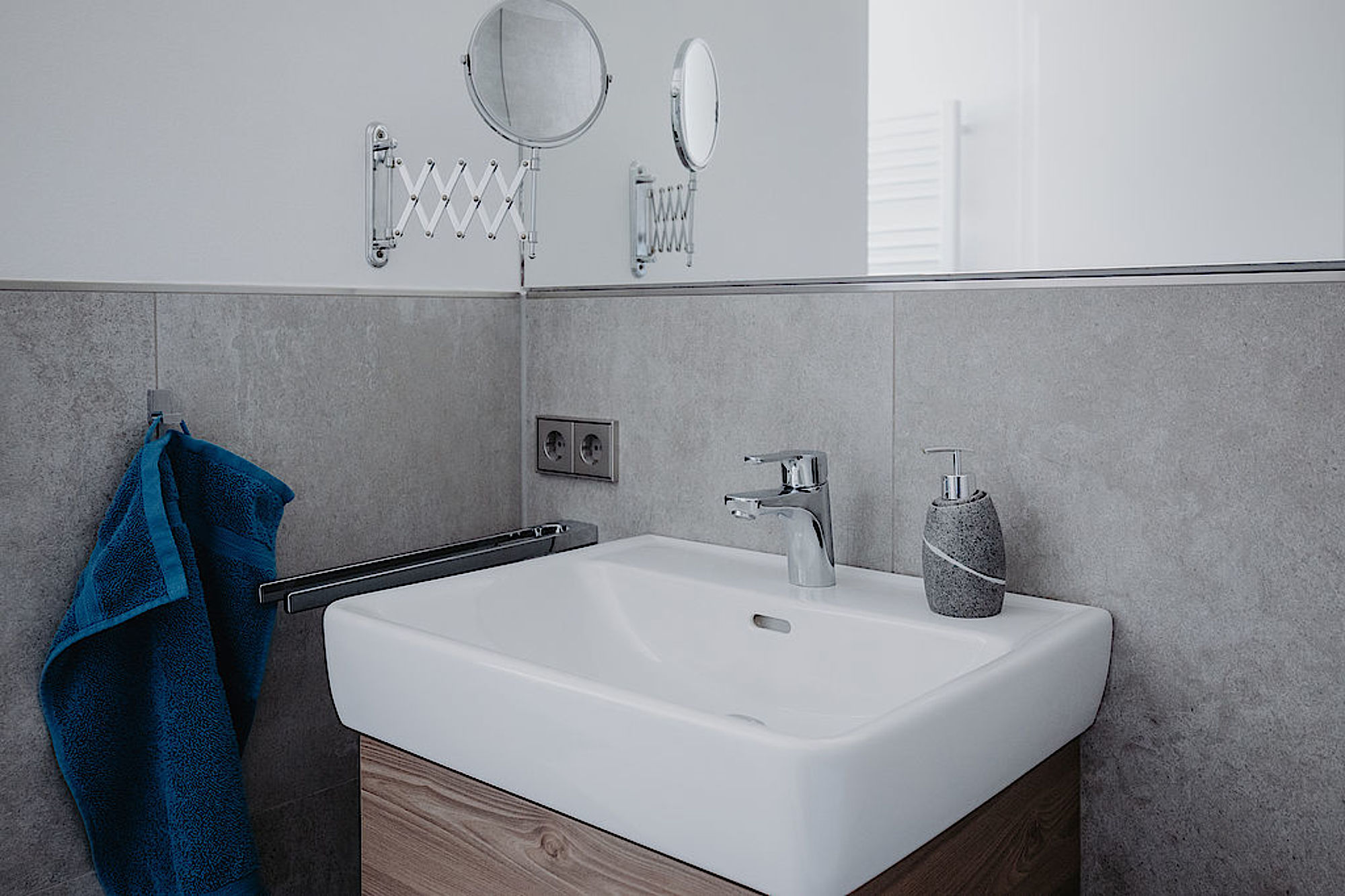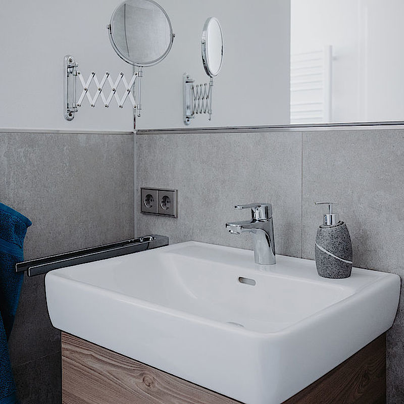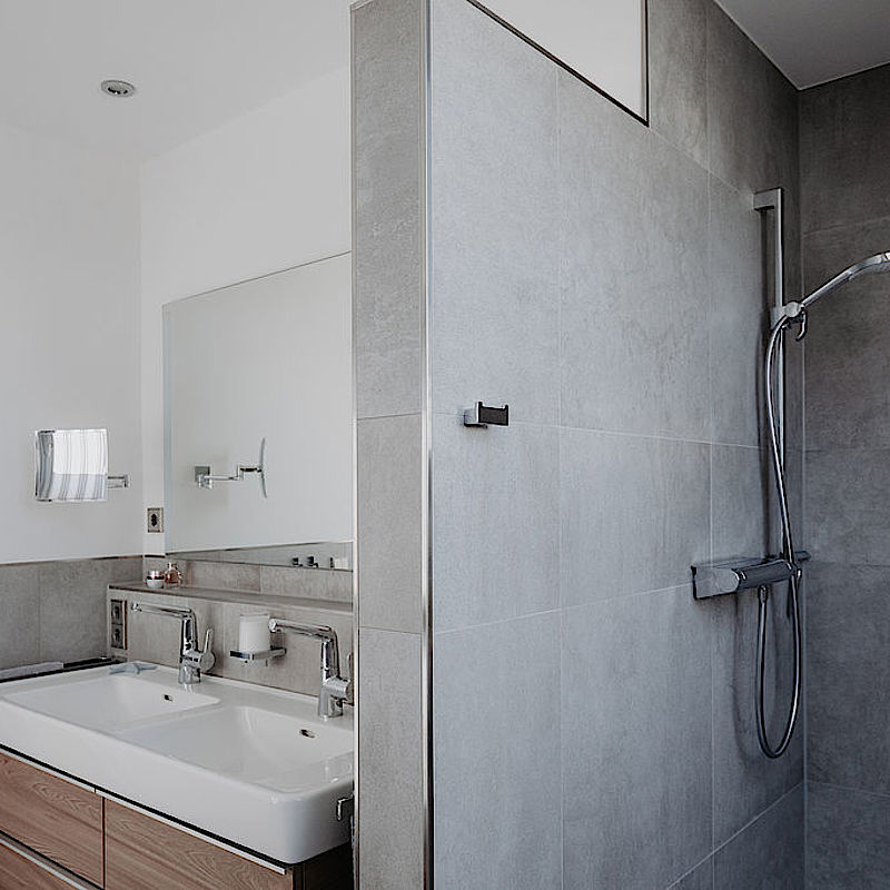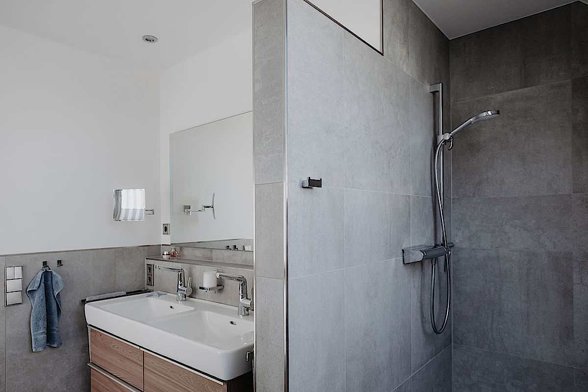 Unser einheitliches Design mit dennoch kleinen abweichenden Details spiegelt sich in beiden Badezimmern wider.
