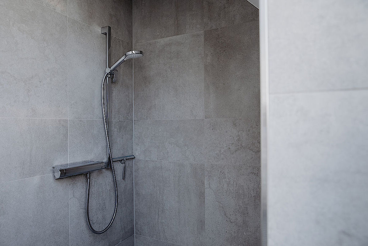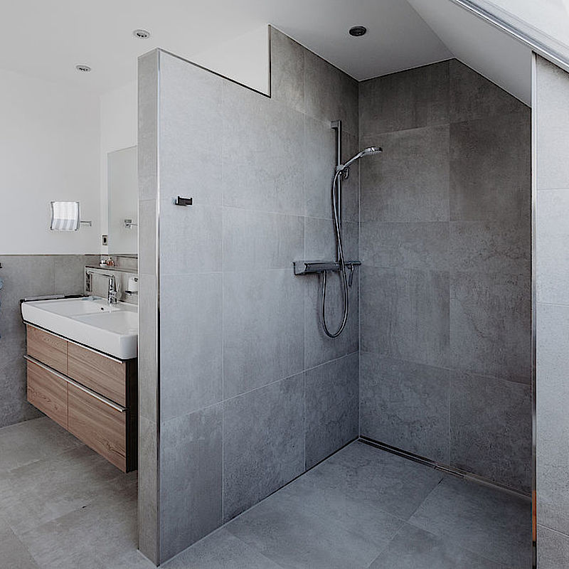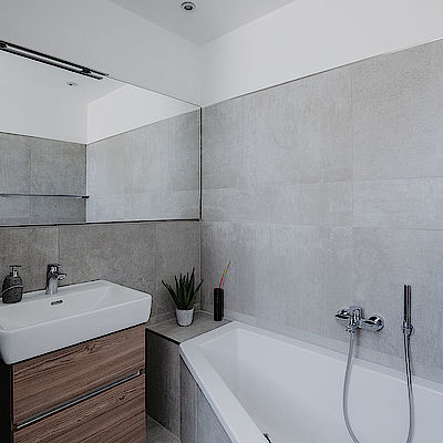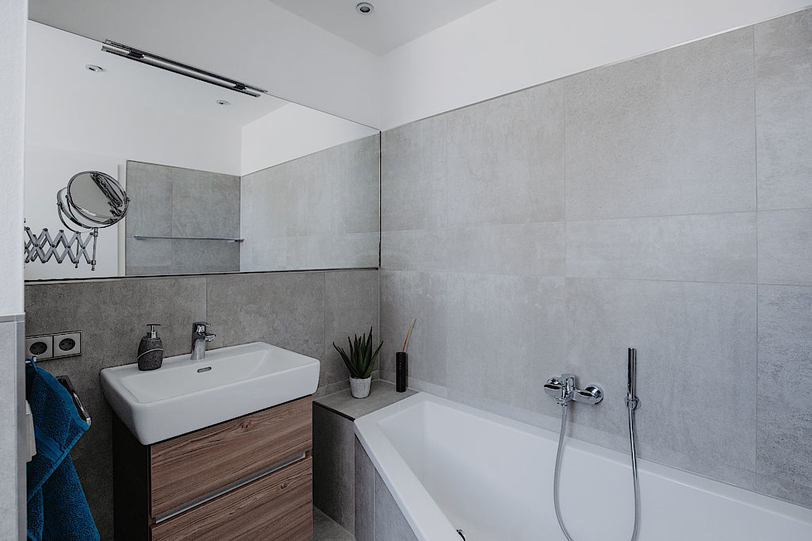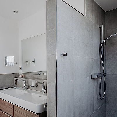 Unser einheitliches Design mit dennoch kleinen abweichenden Details spiegelt sich in beiden Badezimmern wider.