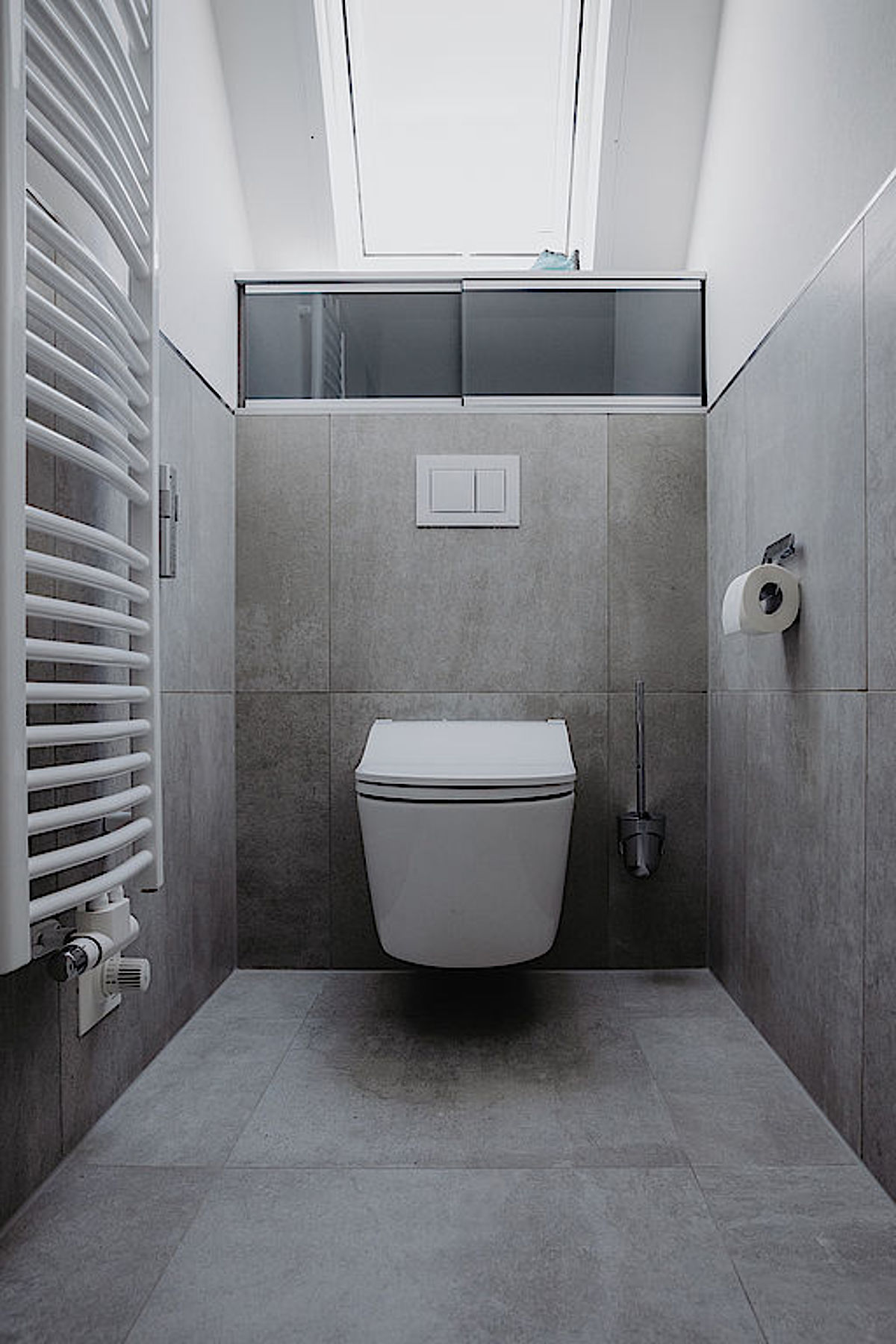 Natürliches Licht fällt über die Dachfenster ins Bad und die Toilette ist ein Highlight für sich. Ein paar Einbauspots runden das Bild ab und sorgen für die perfekte Beleuchtung am frühen Morgen oder späten Abend.