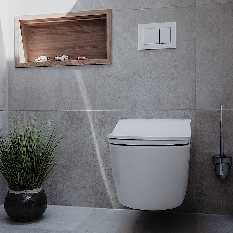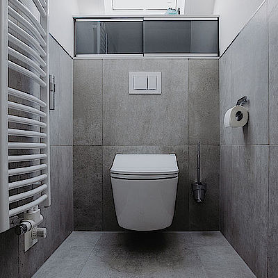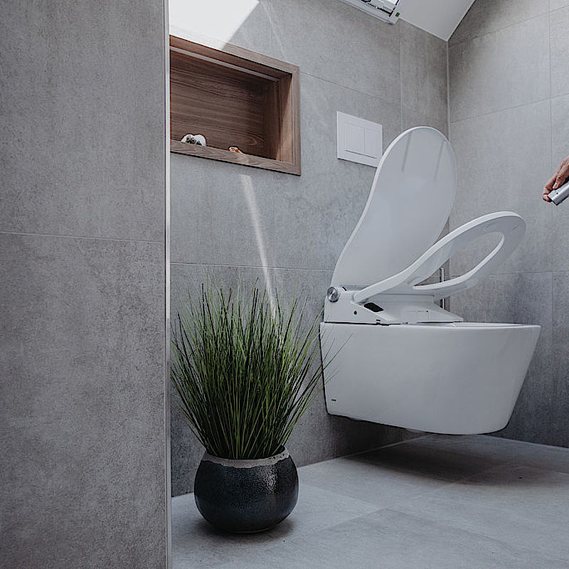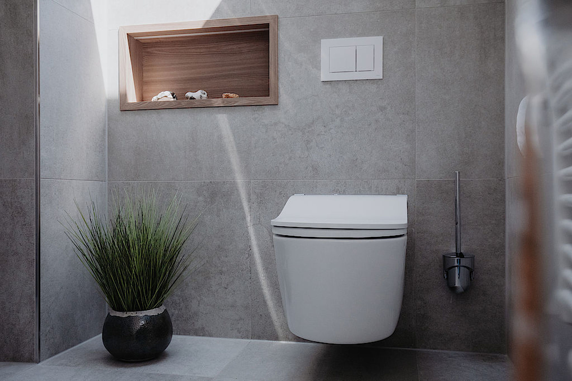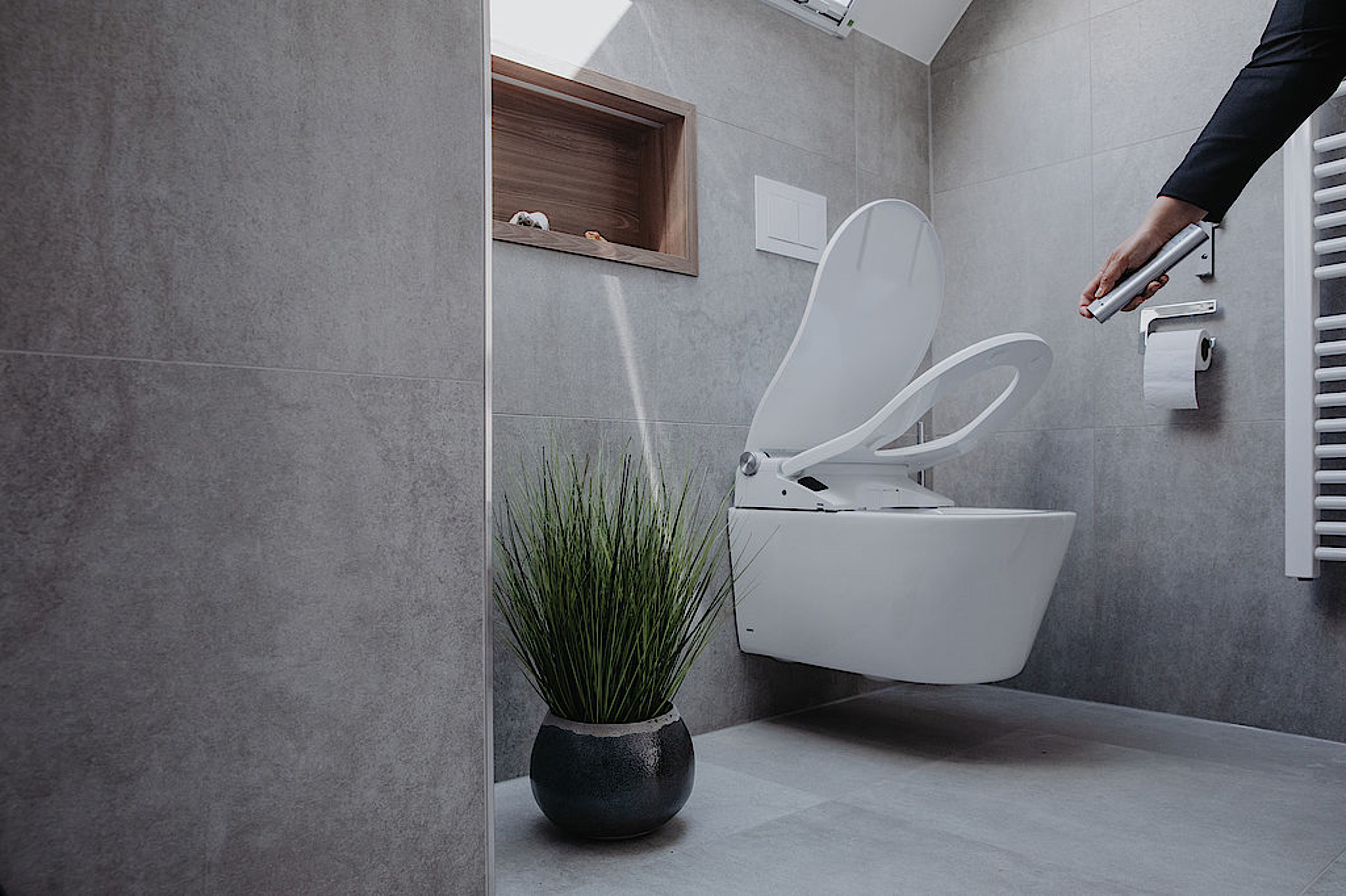Mit dem Dusch-WC zieht ein hochmodernes WC mit einer ganz neuen Hygiene-Perspektive in dieses Badezimmer ein.