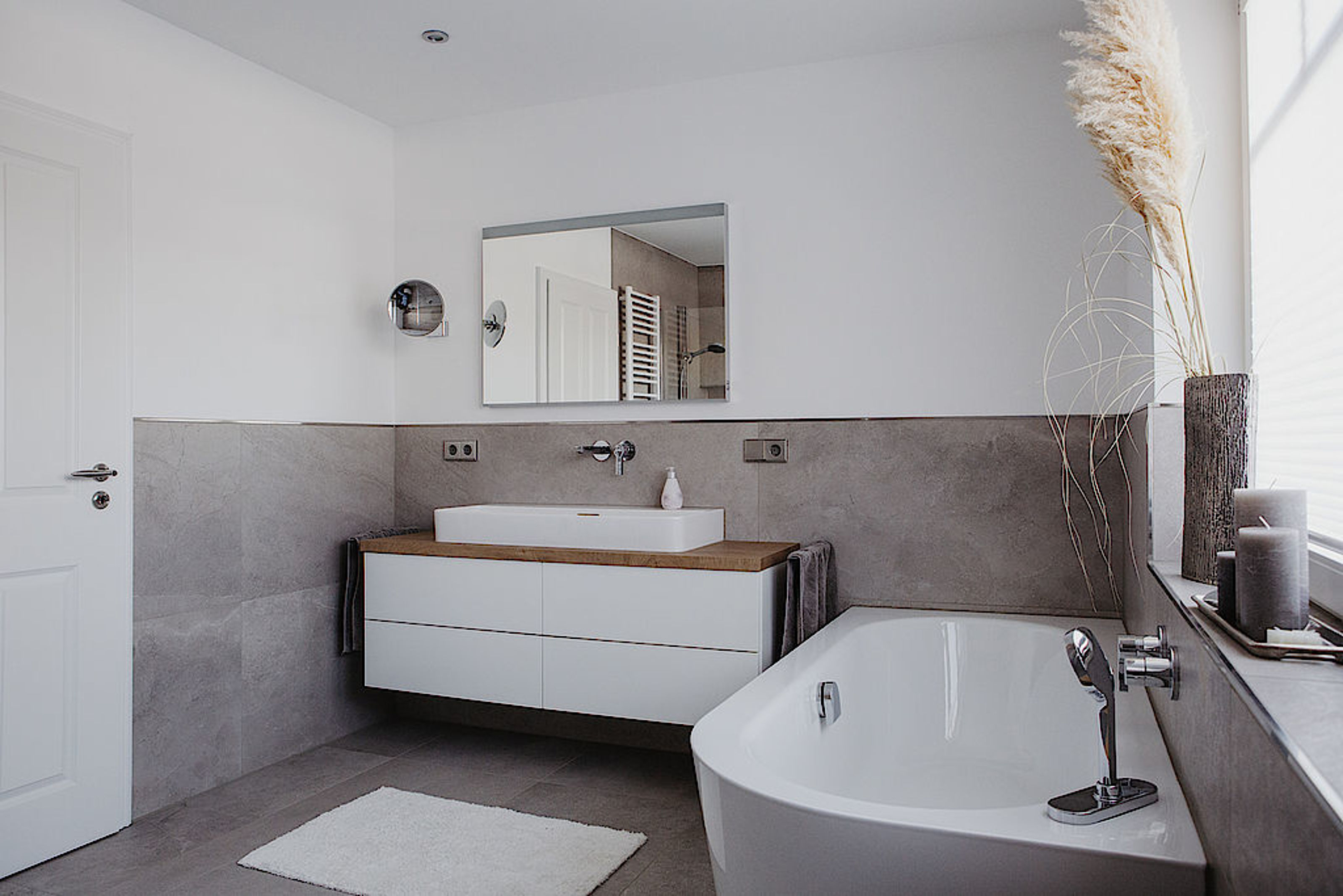 Die Badewanne, mit ihrer geschwungenen Linienführung und dem unaufgeregten Design, fügt sich im schlichten Weiß perfekt in den Raum ein.
