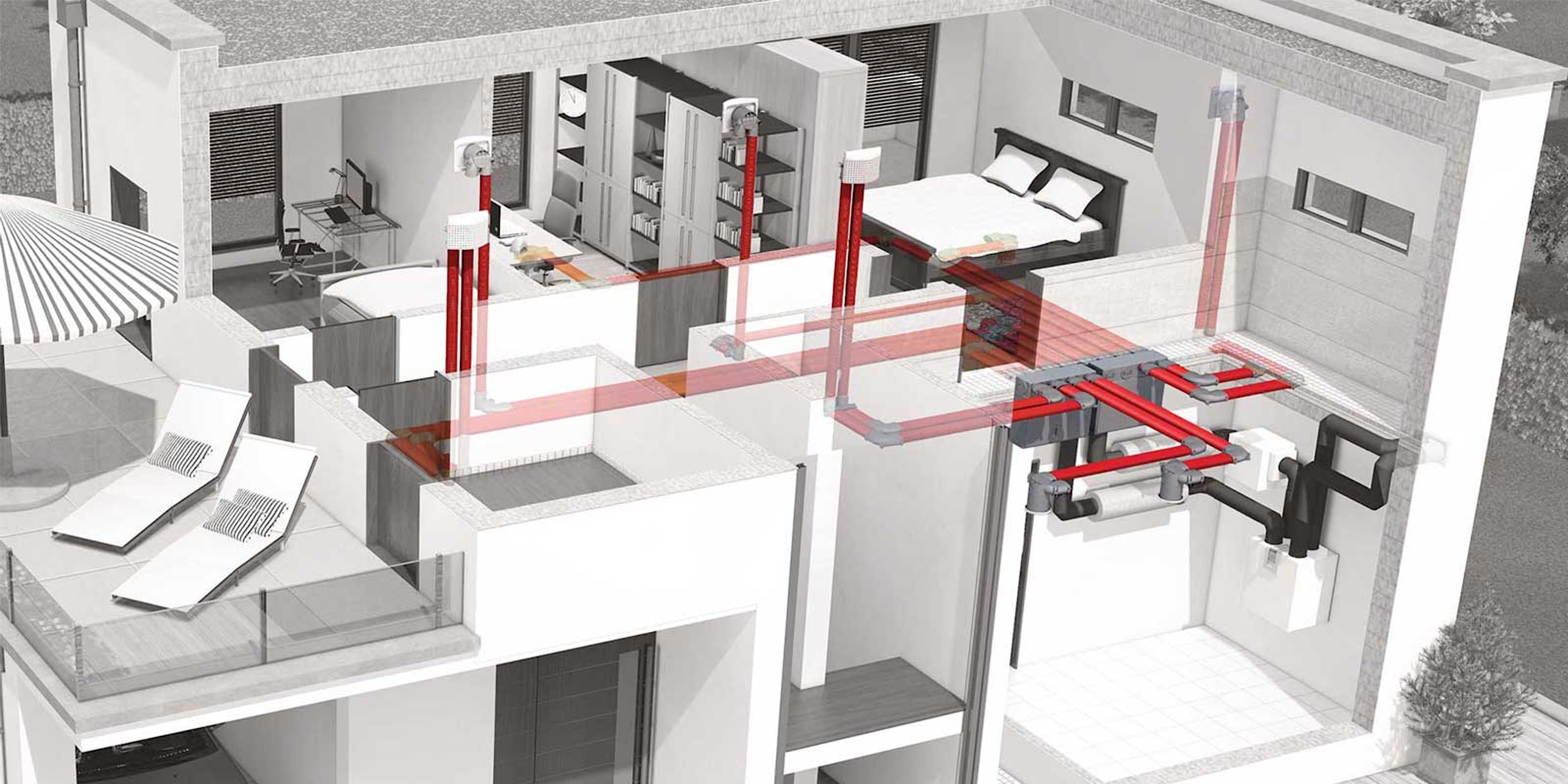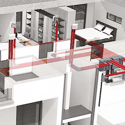 Eine Lüftungsanlage im Neubau als zentrale Wohnraumlüftung ist insbesondere bei Niedrigenergie- und Passivhäusern längst Standard. Neubauprojekte sind häufig bereits mit einer Wohnraumlüftung ausgerüstet, denn diese erfordert eine gute energetische Dämmung, um die Luftfeuchtigkeit möglichst effektiv zu regulieren. Lüftungssysteme im Neubau verfügen über ein zentrales Gerät, welches alle Räume mit Frischluft versorgt. Für eine optimale Wohnraumlüftung ist meist ein Kanalsystem im Fußboden oder in der Wand integriert. Die Luftzirkulation wird von der zentralen Lüftungsanlage automatisch geregelt.