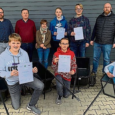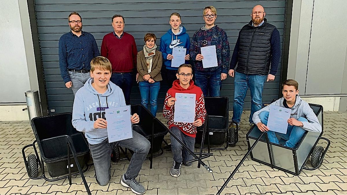 05.03.2020 - Fünf Schüler aus dem Schulzentrum Hasetal-Herzlake haben an einer Generationenwerkstatt des Unternehmens Heinrich Voss Gebäudetechnik in Haselünne teilgenommen. Beim Abschluss präsentierten sie die Ergebnisse ihrer Arbeit: Jeder Schüler hatte seinen eigenen Fahrradanhänger gebaut.