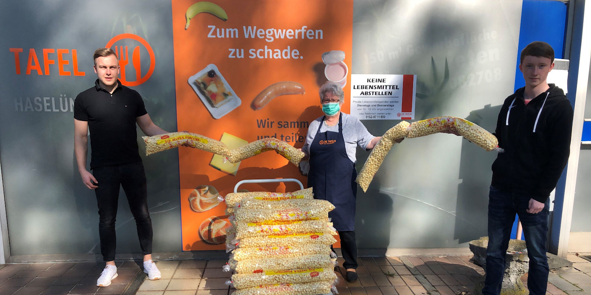 Danke an Tobias Plien und Sebastian Alber von Pop das Korn GbR und natürlich an unsere Superazubis Simon (links im Bild) und Hendrik, die das Popcorn von Rheine nach Haselünne geholt haben.