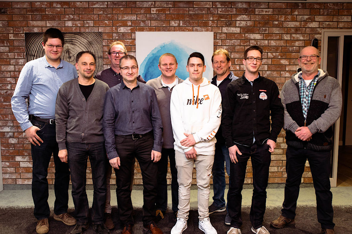 Unsere Jubilare: André Knese, Eckehard Ostendorf, Heinz Thünemann, Rainer Stüwe, Michael Einspannier, Mario Schmidt, Andreas Erdwiens, Michael Dacke und Torsten Dolg (von links nach rechts). Nicht im Bild: Andreas Fangmeyer, Waldemar Fittkau und Ralf Wöhl. Foto: TG-Foto